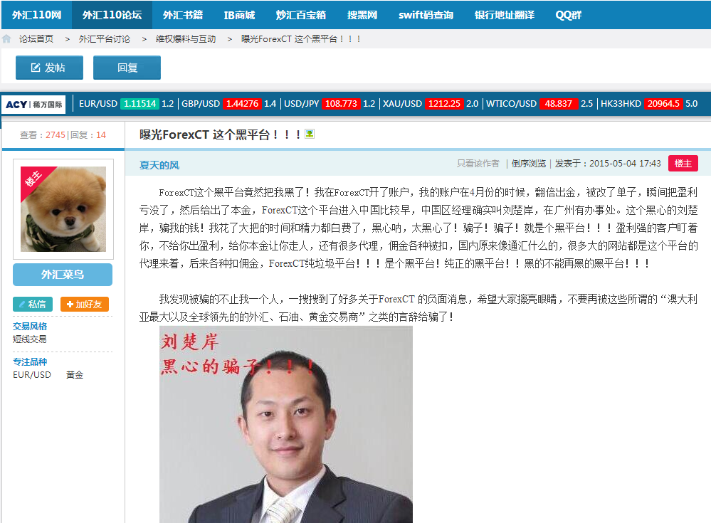查看劉楚岸個(gè)人資料的時(shí)候,把劉楚岸寫的很牛的,F(xiàn)orexCT亞洲區(qū)總經(jīng)理,首席外匯金融策略師。具有逾越10年的外匯金融出資生意經(jīng)歷,曾上任于澳洲出名銀行以及世界出名金融生意商,一同持有世界注冊(cè)金融剖析師和澳大利亞注冊(cè)金融理財(cái)師執(zhí)照,特別是對(duì)澳元走勢有著精準(zhǔn)的見地和剖析。這些年在澳大利亞各大城市以及我國等亞太國家舉辦多場專題外匯金融講座,深得出資者好評(píng)。簡直就像外匯金融市場神一樣的存在,差點(diǎn)就被洗腦家人劉楚岸崇拜的腦殘粉一族了,還好我保持理智又接著往下看更多關(guān)于劉楚岸及ForexCT的信息。頓然看到了許多關(guān)于劉楚岸及ForexCT的負(fù)面消息,有客戶爆料該平臺(tái)是對(duì)賭平臺(tái),還有的說是黑平臺(tái),客戶只有紙面利潤,如果你盈利很多想要出金,平臺(tái)總是給你找各種理由,延遲不給出金,好多人就只好再繼續(xù)做單,但仍然只是紙面資金,不能夠成為現(xiàn)實(shí)財(cái)富,導(dǎo)致許多客戶沒有心情集中精神進(jìn)行做單,開始虧錢,到最后自己的本錢只能一半的時(shí)候不得己選擇出金,這時(shí)候ForexCT才同意出金,客戶到現(xiàn)在都不明白自己之前賺的錢是賺國際外匯市場中的錢還是ForexCT公司自己內(nèi)部的錢,虧損的本金到底虧給了外匯國際市場還是ForexCT公司自己腰包里,不單是一個(gè)客戶反映有此疑問,很多客戶都反映有此問題,在國內(nèi)外匯值得用戶信任的外匯110網(wǎng)上也同樣有客戶爆料劉楚岸及ForexCT,有圖有真相