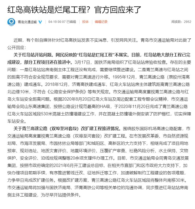 近日有個(gè)別自媒體針對(duì)紅島高鐵站發(fā)表不實(shí)消息,引發(fā)網(wǎng)民關(guān)注。19日凌晨,青島市交通運(yùn)輸局對(duì)此做了公開回應(yīng):