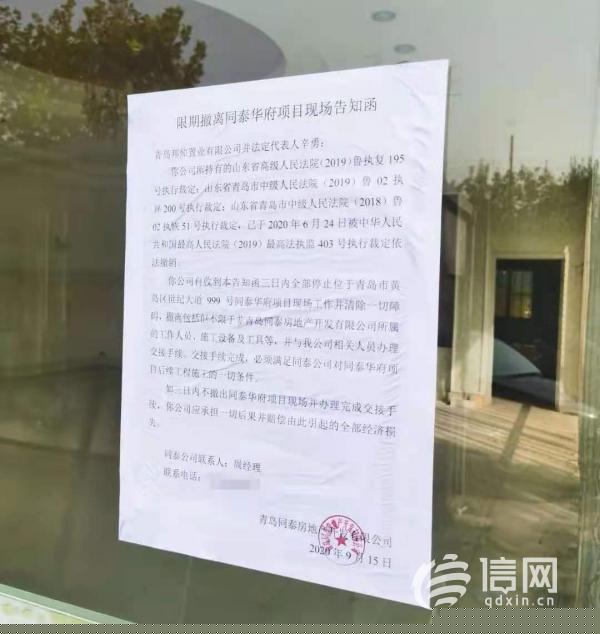 信網了解到,同泰華府小區(qū)于2013年11月份開盤,因開發(fā)商同泰房地產公司與施工方存在糾紛被法院查封,從2014年底開始該項目就逐漸停工建設,原本約定的交房時間也被無限延期。后期經有關部門協(xié)調,2019年青島邦倬置業(yè)有限公司通過法院拍賣獲得該項目,并負責開工建設。2020年9月同泰房地產公司在項目現(xiàn)場張貼出一張告知函稱,因法院執(zhí)行決定撤銷,該公司要求青島邦倬置業(yè)有限公司3日內撤離現(xiàn)場并與同泰房地產公司相關人員辦理交接手續(xù)。