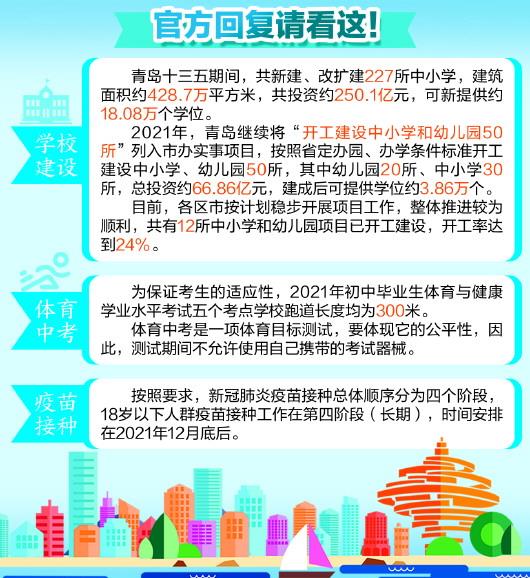 今年已開建12所中小學幼兒園 在訪談中,姜元韶詳細介紹了青島近幾年的新校建設情況。為有效應對二孩政策及新市民增加等因素疊加帶來的學位需求壓力,青島十三五期間,共新建、改擴建227所中小學,建筑面積約428.7萬平方米,共投資約250.1億元,可新提供約18.08萬個學位。