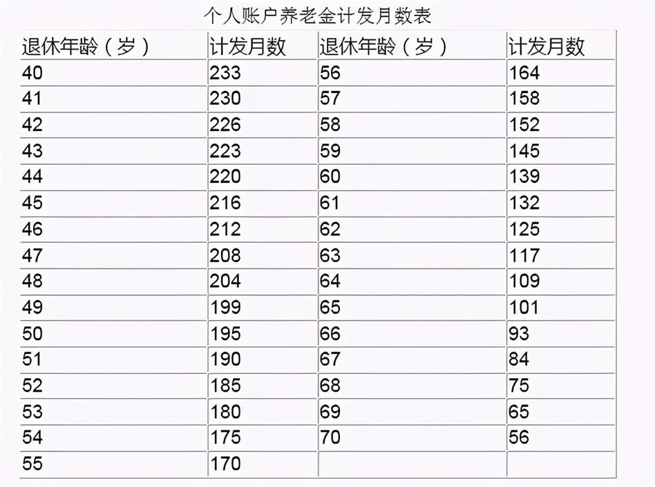目前的個(gè)人賬戶計(jì)發(fā)月數(shù)表規(guī)定是,60歲退休對(duì)應(yīng)的計(jì)發(fā)月數(shù)是139個(gè)月,55歲退休對(duì)應(yīng)的是170個(gè)月,50歲退休對(duì)應(yīng)的是195個(gè)月。