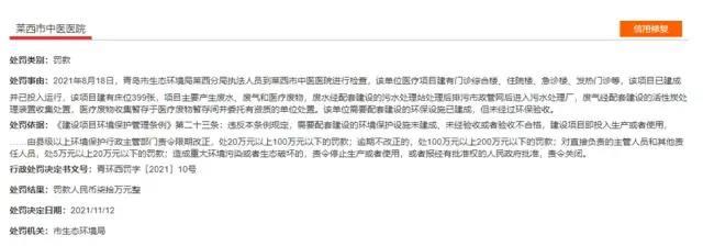 根據(jù)處罰公告,萊西市中醫(yī)醫(yī)院在未通過環(huán)保驗收的情況下即投入運行,被處罰十七萬。