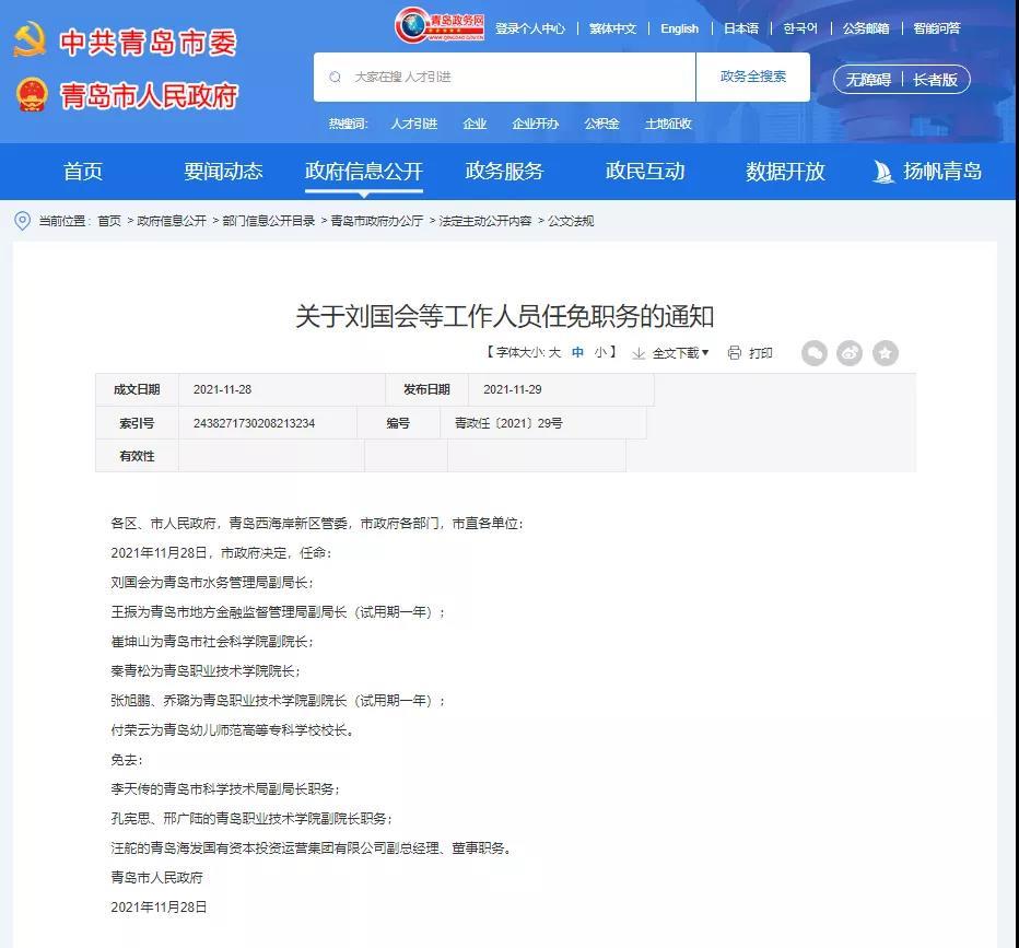 任命: 劉國(guó)會(huì)為青島市水務(wù)管理局副局長(zhǎng);