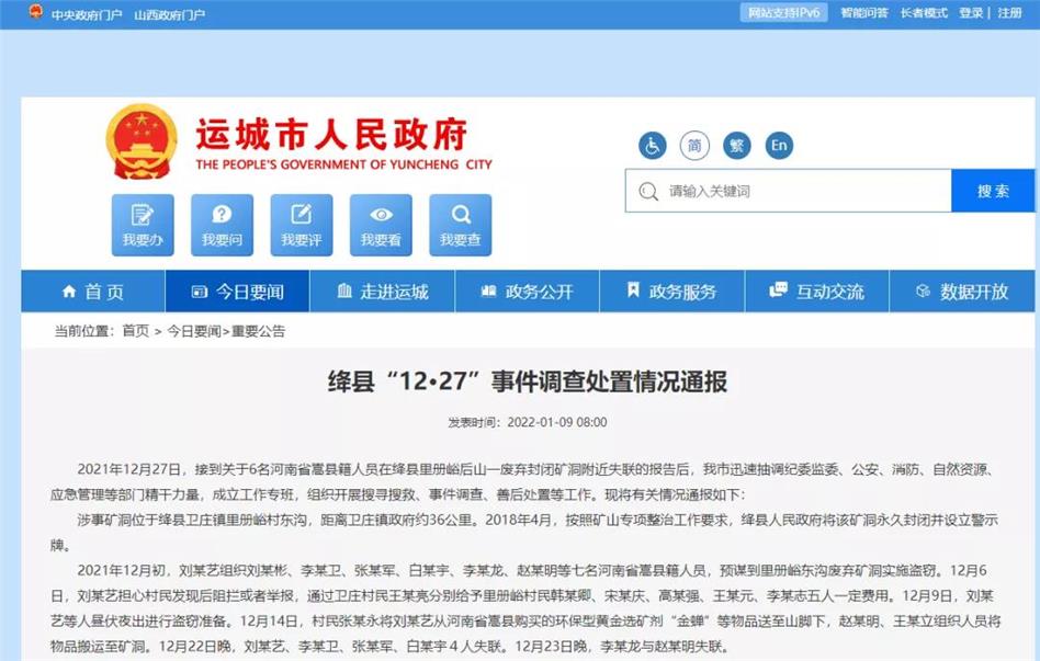2021年12月27日,接到關(guān)于6名河南省嵩縣籍人員在絳縣里冊峪后山一廢棄封閉礦洞附近失聯(lián)的報告后,運城市迅速抽調(diào)紀委監(jiān)委、公安、消防、自然資源、應(yīng)急管理等部門精干力量,成立工作專班,組織開展搜尋搜救、事件調(diào)查、善后處置等工作,F(xiàn)將有關(guān)情況通報如下: