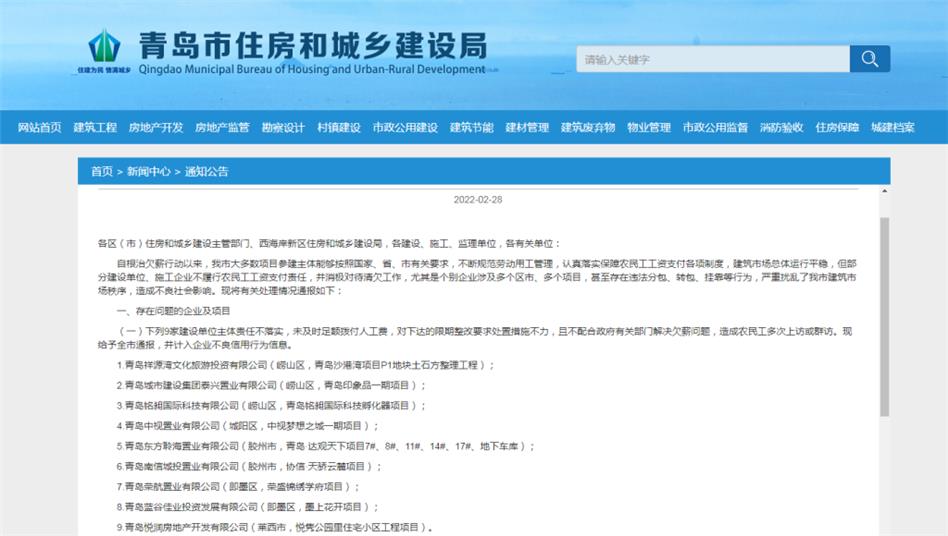 2月28日,青島市住房和城鄉(xiāng)建設(shè)局通報(bào)了房屋建筑領(lǐng)域根治欠薪行動(dòng)發(fā)現(xiàn)問題處理情況,通報(bào)指出,部分建設(shè)單位、施工企業(yè)不履行農(nóng)民工工資支付責(zé)任并消極對(duì)待清欠工作,尤其是個(gè)別企業(yè)涉及多個(gè)區(qū)市、多個(gè)項(xiàng)目甚至存在違法分包、轉(zhuǎn)包、掛靠等行為嚴(yán)重?cái)_亂了青島建筑市場(chǎng)秩序,造成不良社會(huì)影響。