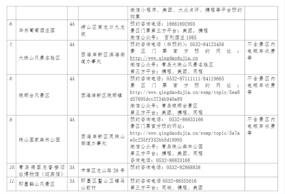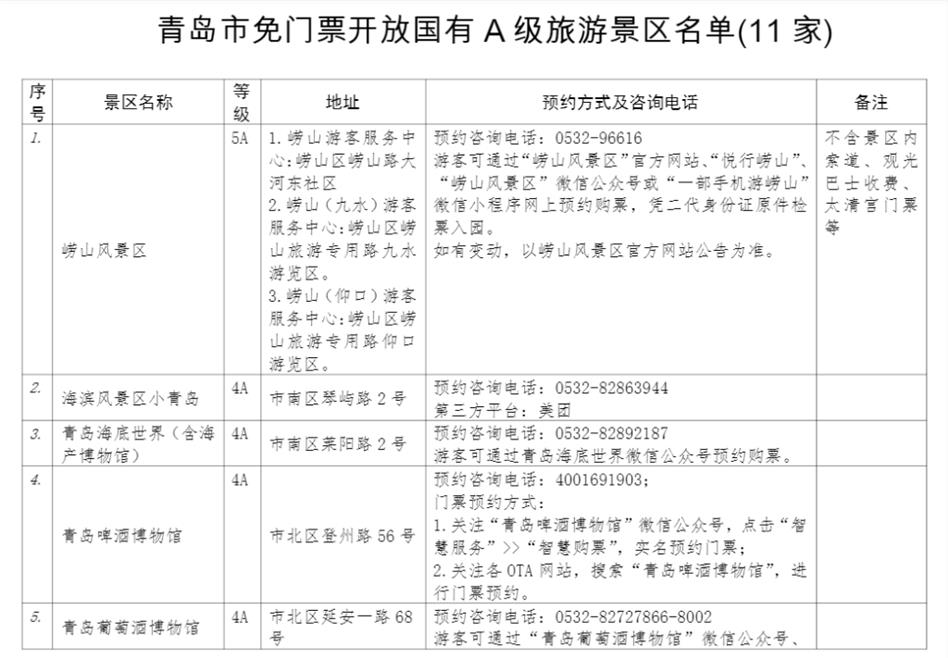 嶗山風(fēng)景區(qū)(5A)、海濱風(fēng)景區(qū)小青島公園(4A)、青島海底世界(4A)、青島啤酒博物館(4A)、青島葡萄酒博物館(4A)、華東葡萄酒莊園(4A)、大珠山風(fēng)景名勝區(qū)(4A)、瑯琊臺風(fēng)景區(qū)(4A)、珠山國家森林公園(4A)、青島德國總督樓舊址博物館(迎賓館3A)、即墨鶴山風(fēng)景區(qū)(3A)。免門票政策是指免除景區(qū)首道門票,不包括景區(qū)內(nèi)其他參觀游覽項目和服務(wù)設(shè)施收費。截止目前,本市累計免門票開放的 A 級旅游景區(qū)已達(dá)56家。