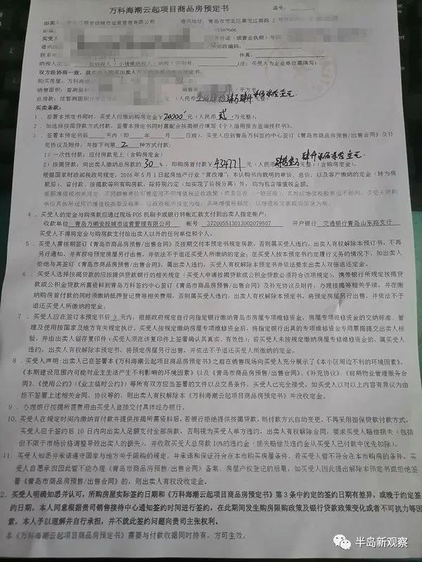 “如果對方不說20%首付,我是不會交定金的!笔忻窭钕壬榻B,5月22日,他在城陽怡海路順城萬科海潮云起小區(qū)看房,當時接待他的置業(yè)顧問說,現(xiàn)在只需要20%首付就可以購房,利率可以做到4.25%。聽到這樣的好消息,李先生沒有猶豫,就交了2萬定金簽了協(xié)議。但在簽協(xié)議時,李先生卻看到協(xié)議上寫的是30%首付!拔荫R上就提出了質(zhì)疑,但是置業(yè)顧問卻說,這個政策馬上就要推出,只是時間的問題。”李先生說,聽了置業(yè)顧問的話,他雖然將信將疑,但還是簽了協(xié)議。