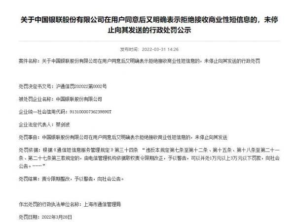 一條垃圾短信似乎危害不大,但長此以往默認就變成了縱容。針對多次收到商業(yè)短信的情況,賈先生在向行業(yè)主管投訴的同時,還已于今年1月向中國銀聯(lián)注冊地的人民法院提起訴訟。2022年3月,上海市通信管理局在其官網(wǎng)公開了一份行政處罰公告,中國銀聯(lián)因“在用戶同意后又明確表示拒絕接收商業(yè)性短信息的,未停止向其發(fā)送”,被責令限期整改,予以警告。