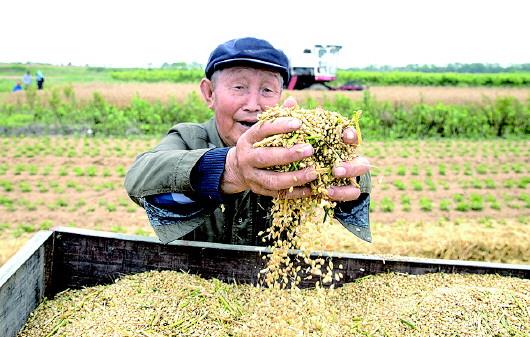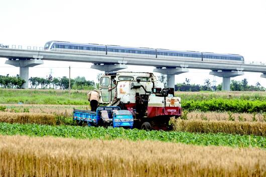麥浪翻空沃野黃,又到小麥?zhǔn)斋@季節(jié)。6月14日,即墨溫泉街道的麥田里,聯(lián)合收割機穿梭在金色的麥浪之間,與經(jīng)過的輕軌形成了一道美麗的風(fēng)景。溫泉街道唐家莊的老唐看著自家地里的三畝麥子喜獲豐收,比較開心。老唐一個人來到地頭,啥都不用干,看著聯(lián)合收割機穿梭幾個來回,拖拉機就將收獲的麥子直接拉回家了!敖衲晔莻豐收年,我家的麥子畝產(chǎn)一千多斤,一畝地比去年至少多收200多斤。”老唐捧著麥子介紹。