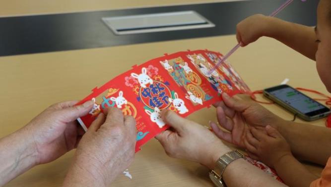 據(jù)介紹,本次活動以家庭為單位,由家長和孩子們共同完成花燈成品;顒又,國立社工們一早將制作燈籠的材料包給居民們準(zhǔn)備好,一邊耐心地給居民講解花燈制作的過程,一邊示范花燈的制作步驟。摳圖案,按平安穗,插花邊空……居民們互幫互助,現(xiàn)場歡笑聲不斷,不一會兒,一個(gè)個(gè)祝福花燈在居民的巧手中完成了。