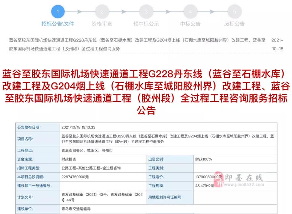 投資228億!藍(lán)谷至膠東機(jī)場快速路招標(biāo)公告發(fā)布!將連接即墨、城陽、膠州