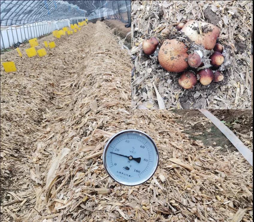 秸稈生物熱氣肥是對傳統(tǒng)秸稈生物反應堆的升級改造,用全生物降解地膜包裹的方式在秋季定植時施用熱氣肥,冬季根據需要隨時用工具打孔,扎破降解地膜,水分滲入就可以啟動原料發(fā)酵,達到秸稈生物熱氣肥的緩釋效果。它能有效提高地溫,補充棚內二氧化碳濃度,使冬季設施種植作物提前上市,延長生育期,進而達到增產增收效果。