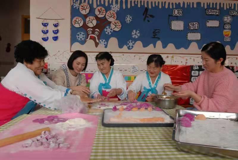 居民們分工協(xié)作,包餡、擺盤,忙得不亦樂乎,用自己拿手的方式包著各式各樣的餃子。居民和居住在本社區(qū)的朝鮮族居民們洗菜、和面、搟皮……活動現(xiàn)場儼然成了“歡樂大廚房”,大家分工協(xié)作,配合默契,個(gè)個(gè)動作嫻熟,一雙雙靈巧的手把濃濃的冬至情包進(jìn)圓鼓鼓的餃子里。大家有說有笑,現(xiàn)場氣氛溫情融洽、笑語不斷,居委會里洋溢著“家”的溫馨、“家”的味道,密切了鄰里關(guān)系。你拌餡,我搟皮,一邊忙著包餃子,一邊開心拉家常,其樂融融……