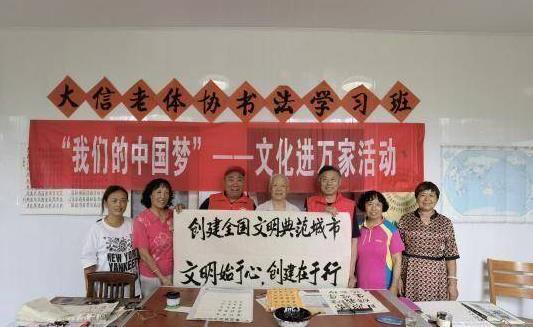為進(jìn)一步推進(jìn)全國(guó)文明典范城市創(chuàng)建工作,加大創(chuàng)城宣傳力度,豐富老年人文化生活,8月11日,即墨區(qū)大信街道老體協(xié)的7名書法志愿者,結(jié)合全國(guó)文明典范城市創(chuàng)建,開展“藝”起創(chuàng)城文化進(jìn)萬(wàn)家書法主題活動(dòng)。此次活動(dòng)旨在用文藝作品宣傳全國(guó)文明典范城市創(chuàng)建,傳播正能量,引領(lǐng)社會(huì)文明風(fēng)尚,為文明城市創(chuàng)建“增光添彩”。