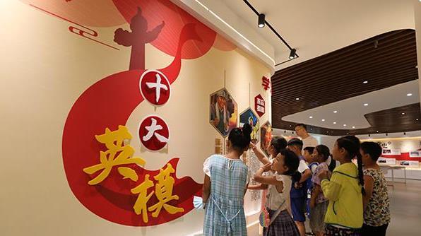 7月28日,山東省即墨區(qū)龍山街道麗山社區(qū)工作人員向孩子們講述十大英模的光輝事跡