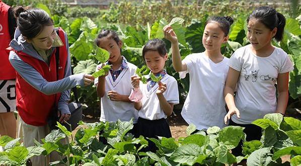 志愿者帶領(lǐng)學(xué)生們到附近的農(nóng)田認(rèn)識(shí)各種農(nóng)作物。