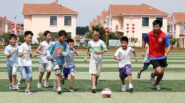 7月18日,在山東省青島市即墨區(qū)龍山街道前東葛村,山東理工大學(xué)大學(xué)生志愿者姜昊(右一)與孩子們一起踢足球。