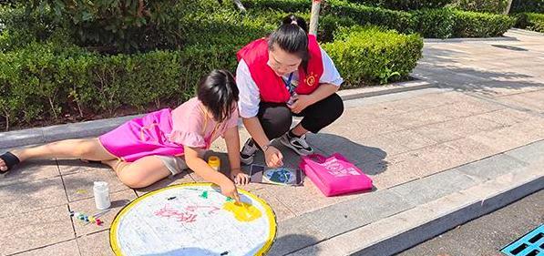 志愿者帶領(lǐng)孩子們在小區(qū)井蓋上繪畫
