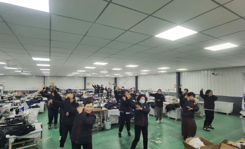 在車間內(nèi),縫紉工人放下手頭的工作,開始排練