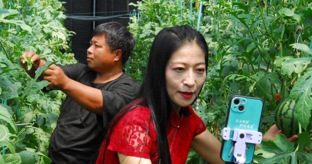 網絡主播走進大棚,向觀眾介紹迷你西瓜。