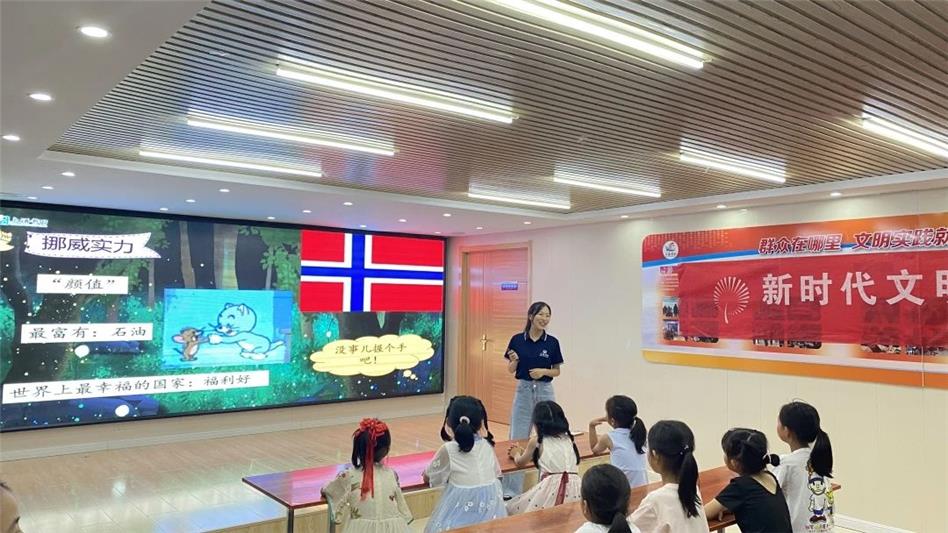 在課程中,劉老師首先通過提問的方式,吸引孩子們對故事內容的興趣,接著詳細介紹了故事作者的生平、風格及代表作,并對作者的家鄉(xiāng)挪威和故事的主角鴨子的相關信息進行了拓展延伸,最后在老師的引領下,孩子們對故事內容有了更深入的理解。