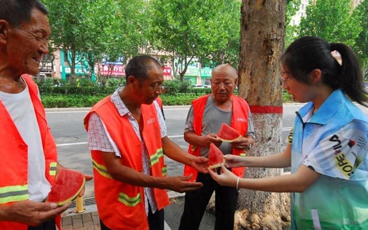 連日來,即墨區(qū)環(huán)秀街道濱湖社區(qū)青年志愿者們帶著充足的礦泉水、西瓜和滿滿的愛心,向辛勤工作的環(huán)衛(wèi)工人送去清涼的福利和誠摯的問候,再三叮囑他們高溫天氣一定要時(shí)刻注意身體狀況,做好防暑降溫工作。同時(shí)感謝他們用勤勞的雙手為轄區(qū)營造了整潔、舒適的環(huán)境,讓頂著酷暑忙碌在街頭巷尾的他們實(shí)實(shí)在在感受到了一絲清涼。環(huán)衛(wèi)工人手里拿著冰水,吃著西瓜,臉上露出了燦爛笑容,心里也是倍感涼爽。