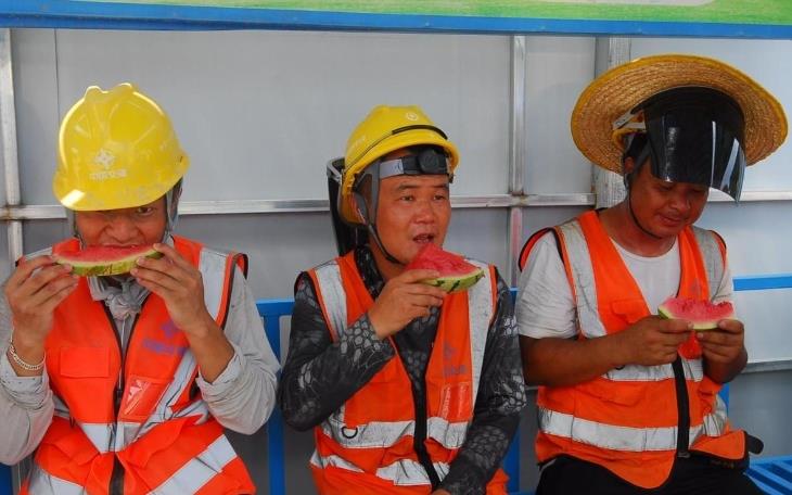 “你們辛苦了!高溫天氣作業(yè)一定要注意休息!薄白罱鼩鉁剌^高,大家中午可以來“清涼驛站”休息、避暑......”在青島市即墨區(qū)北部快速路改建工程的施工現(xiàn)場,青年志愿者們將霍香正氣水、夏桑菊、風(fēng)油精等消暑藥品送到建筑工人手上,讓他們?cè)诟邷靥鞖飧惺艿浇z絲清涼!肮こ陶幱诮ㄔO(shè)重要時(shí)刻,為了做好前期的各項(xiàng)工作,我們苦點(diǎn)累點(diǎn)都是值得的。”來自福建省莆田市建筑工人吳辰宇擦了擦臉上的汗水對(duì)記者露出憨厚的笑容。