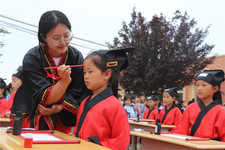 活動(dòng)在“正衣冠”環(huán)節(jié)中開始,學(xué)生們身著統(tǒng)一的傳統(tǒng)服飾,整齊劃一地整理自己的衣著,寓意著從此刻起,要以嶄新的面貌和姿態(tài)迎接學(xué)習(xí)生涯。在“啟蒙描紅”環(huán)節(jié)中,拿起毛筆,在老師的指導(dǎo)下,一筆一劃地描紅“人”字。這個(gè)簡(jiǎn)單的字卻蘊(yùn)含著深刻的道理,提醒學(xué)生們要做人正直、堂堂正正。隨后,學(xué)生們?cè)?/span>“朱砂啟智”“擊鼓明志”“行拜師禮”頌讀《三字經(jīng)》等一系列環(huán)節(jié),感受到了中華文化的博大精深和無(wú)窮魅力。
