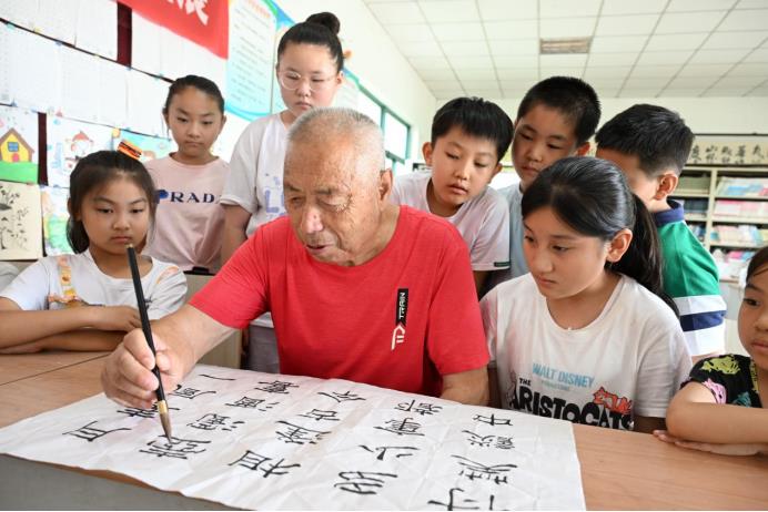 “我們學(xué)習(xí)的是撇、點(diǎn)、捺……”7月16日,在山東省青島市即墨區(qū)龍山街道西程哥莊村的暑假公益托管班上,90歲的江敦仁正耐心地指導(dǎo)小學(xué)生寫毛筆字。還有20多名小朋友都在認(rèn)真地學(xué)習(xí)毛筆字。今年已經(jīng)是江敦仁從中學(xué)校長(zhǎng)的崗位退休后的第20年在暑假公益托管班教孩子們學(xué)習(xí)書法。