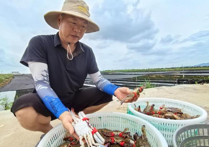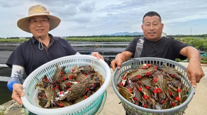 在丁字灣另一片蟹田,42歲的養(yǎng)殖戶鄭剛也迎來(lái)了豐收的忙碌。他采用蟹蝦混養(yǎng)模式的上百畝蟹塘里,起獲的梭子蟹平均半斤一只,活力十足!敖衲觌m然氣溫偏高,但收成沒(méi)受影響,畝產(chǎn)穩(wěn)穩(wěn)200斤沒(méi)問(wèn)題!”鄭剛介紹。