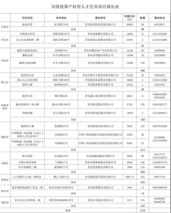 青島發(fā)布最新市級統(tǒng)籌產(chǎn)權(quán)型人才住房項目情況表 共計1772套房源