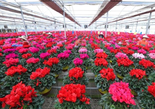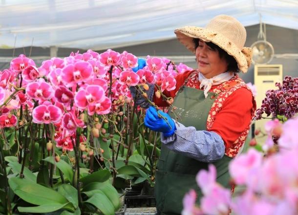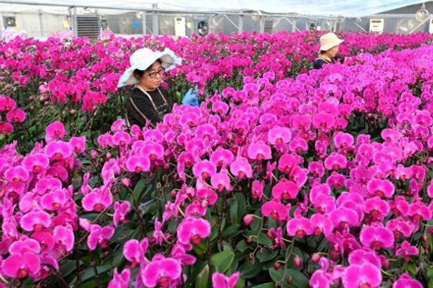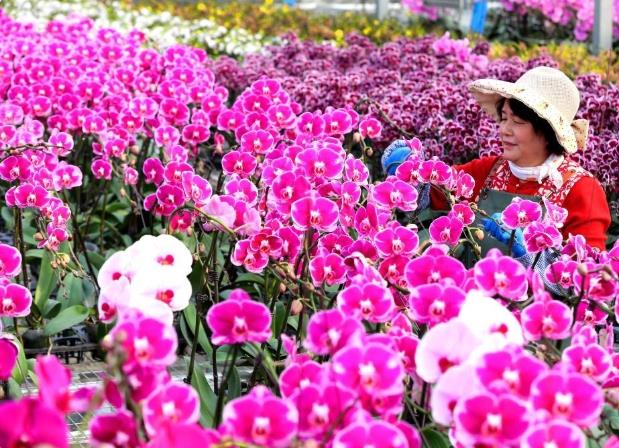 1月25日,花農(nóng)在青島市即墨區(qū)靈山花卉文化產(chǎn)業(yè)園管護花卉。 春節(jié)臨近,山東省青島市即墨區(qū)靈山花卉文化產(chǎn)業(yè)園的年宵花迎來生產(chǎn)和銷售旺季,花卉大棚內(nèi)的蝴蝶蘭、長壽花、仙客來等競相綻放,花農(nóng)們按照訂單外運各類花卉,供應節(jié)日市場。 新華社發(fā)(張光明攝)