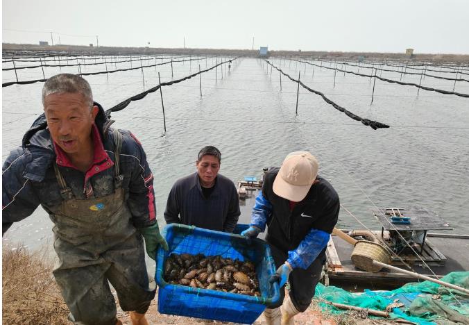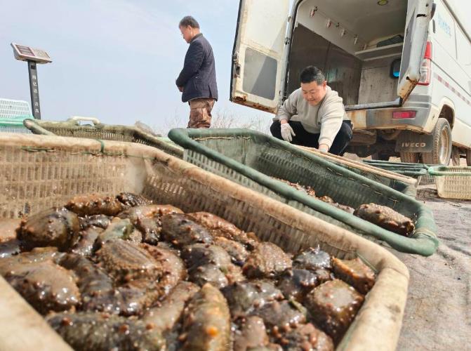 3月23日,青島市即墨區(qū)田橫鎮(zhèn)4萬畝春參迎來頭茬收獲季,養(yǎng)殖池邊一派繁忙景象。今年春參畝產(chǎn)達二三百斤,每天上岸兩三萬斤,單只最重可達一斤多,收購價穩(wěn)定在每斤35元左右,與去年同期基本持平。